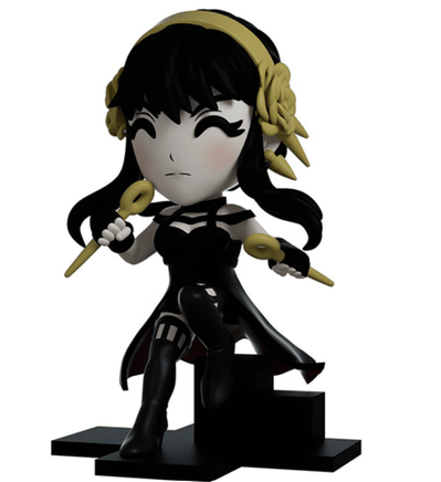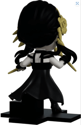 Office clerk by day and deadly assassin by night, Yor accepts her contract to take out Youtooz! At 4.5 inches tall, the fearsome Thorn Princess is posed wielding a deadly golden needle in each hand as she lands gracefully with her elegant black dress flowing back to reveal its red interior. Her long black hair sits under a stunning gold flower headband and falls in two long strands to frame her determined blushing face, while the rest is held in place with thick braids around the back of her head. Ever professional, she diligently works to keep her profession from her family, however that may be difficult after a few drinks…